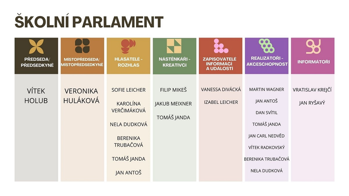 Náš školní parlament je složen ze dvou zástupců z každé třídy od 6. do 9. ročníku a koordinují ho paní učitelky Mgr. Monika Rybnikářová a Mgr. Anděla Kubová.